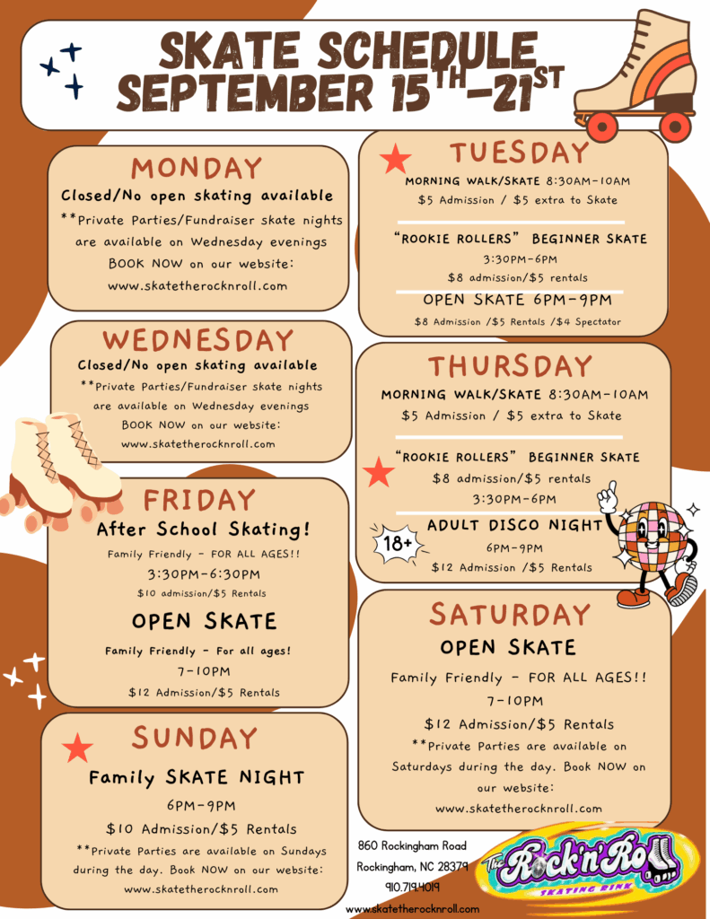 If you’re an early bird, come join us every Tuesday and Thursday morning for an early bird walk/skate, or join us right after school from 3:30-6pm Tues/Thurs. for our ‘Rookie Rollers’ beginner skate. Beat the crowd and the heat! We have so much to look forward to in the coming weeks and we cannot wait to share the experience with you! Don’t forget we offer private parties throughout the week and weekends! Find us at ‘The Rock N Roll’ on Facebook, Tik Tok, Instagram or through our website, www.skatetherocknroll.com.